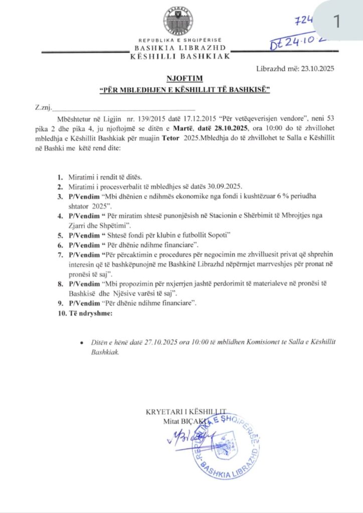 Ditën e Martë, datë 24.06.2025 ora 10:00 do të zhvillohet mbledhja e Këshillit Bashkiak për muajin Qershor. Mbledhja do të zhvillohet te Pallati i Kulturës “Sadi Halili” kati II-të, me këtë rend dite:
